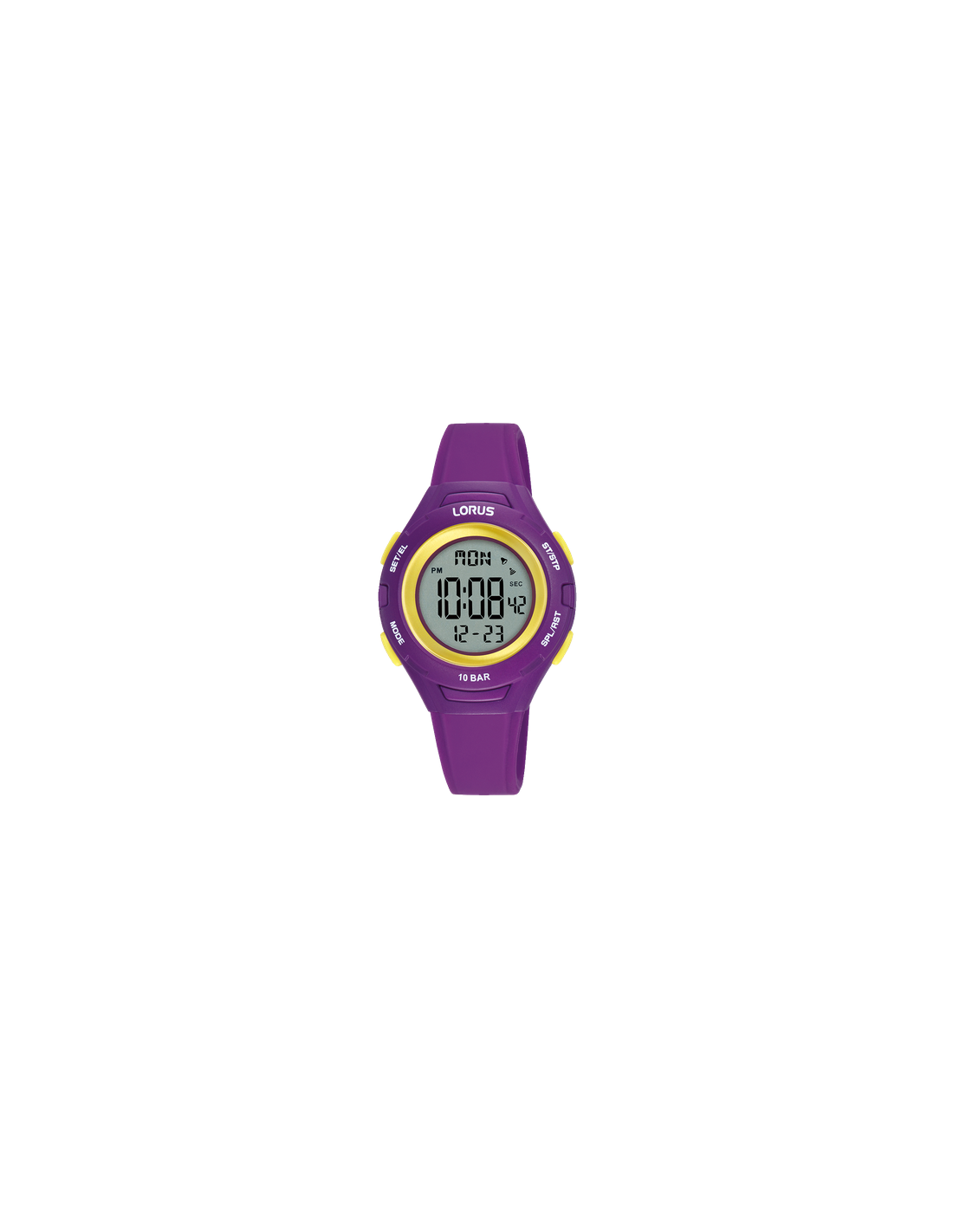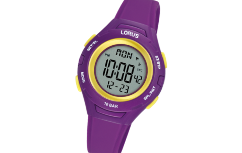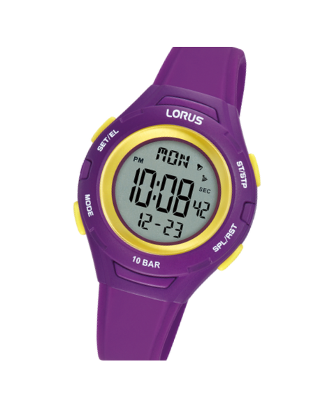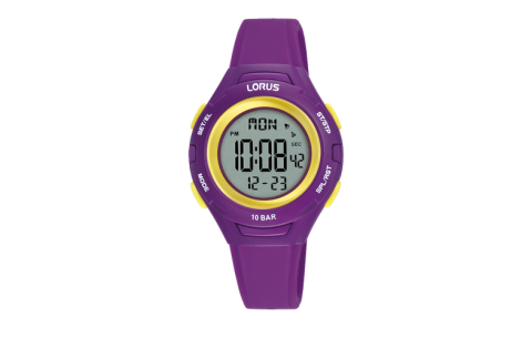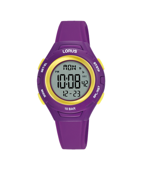 La Lorus R2397PX9 est une montre digitale junior au design dynamique, avec un boîtier de 32 mm en résine violet et un bracelet en silicone assorti.
