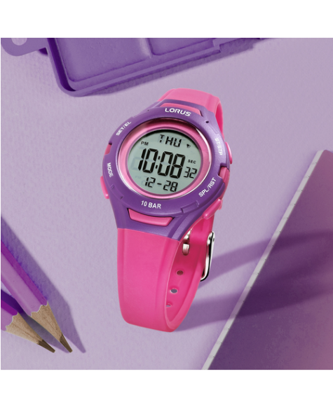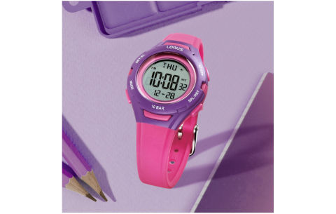 La Lorus R2395PX9 est une montre digitale junior au boîtier en résine violet de 32 mm et au bracelet en silicone rose, alliant légèreté et confort.
