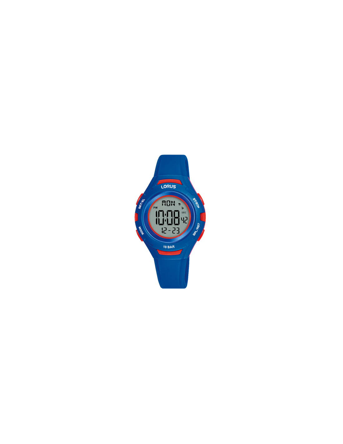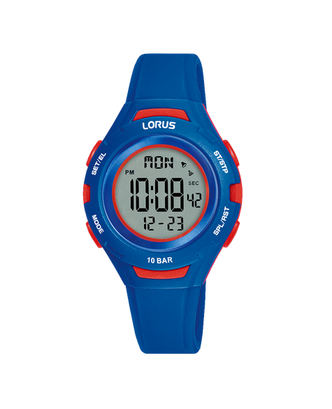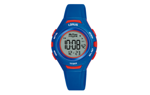 La Lorus R2389PX9 est une montre digitale junior au design sportif et coloré, avec un boîtier de 32 mm en résine bleu & rouge et un bracelet en silicone bleu.