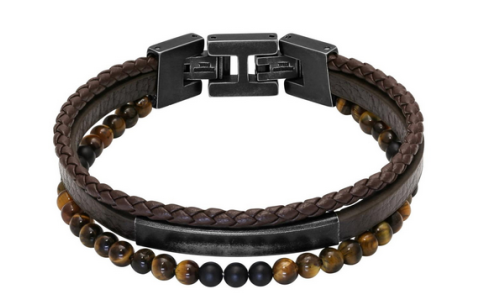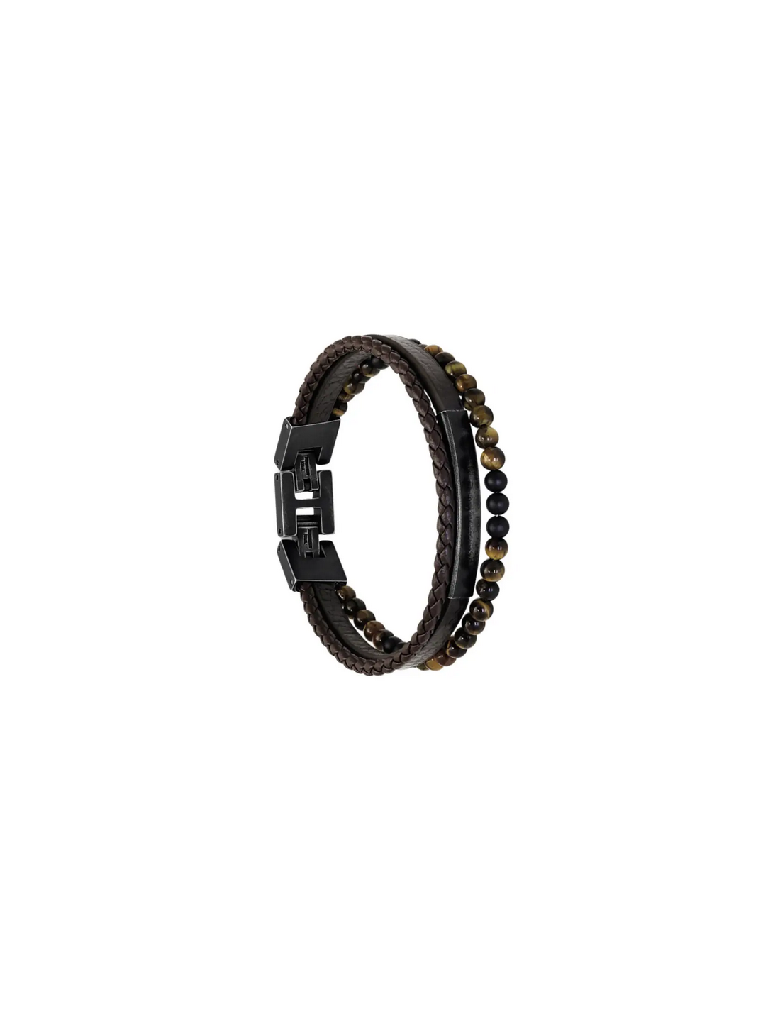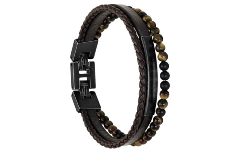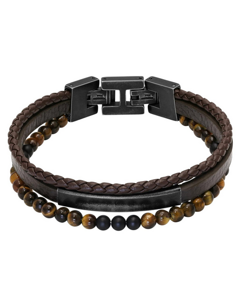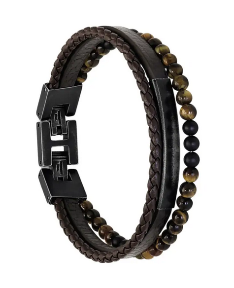 Un bracelet masculin au style affirmé, combinant acier anthracite, cuir marron et perles d'Œil de tigre. Son design multi-cordons apporte une touche moderne et élégante. Fermoir ajustable pour un confort parfait. Un accessoire polyvalent, idéal pour un look chic ou décontracté.