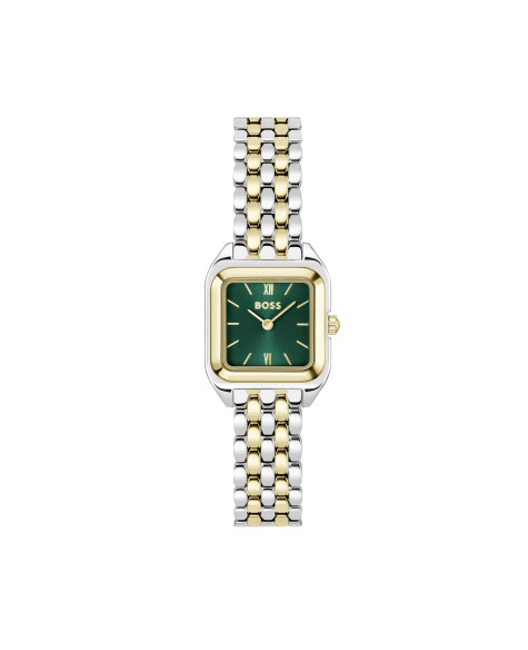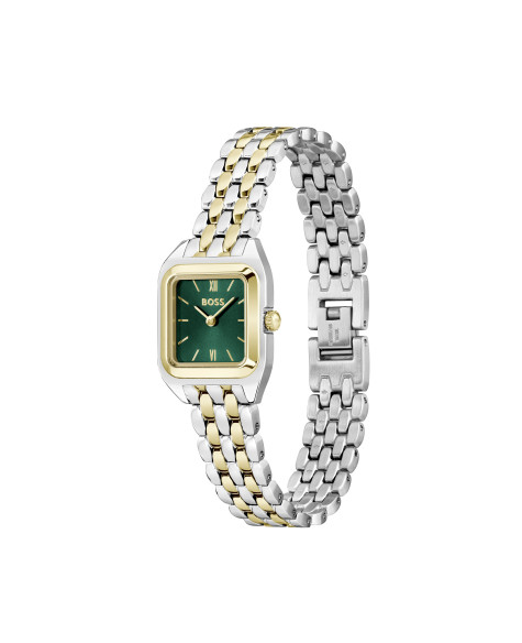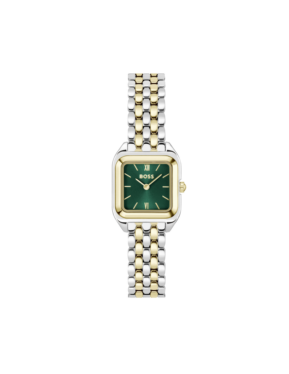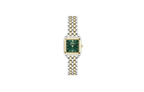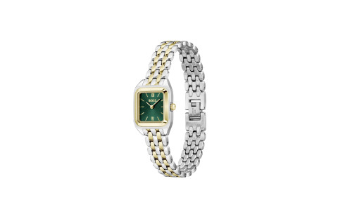 Dotée d'un boîtier carré discret et d'un cadran vert brossé soleil, la Mae Petite apporte une touche d'élégance originale à toutes vos tenues. Le boîtier bicolore de 22 mm abrite un mouvement quartz fiable, porté sur un bracelet acier mêlant tons argentés et dorés. Une montre compacte et féminine, au caractère affirmé sans ostentation — parfaite pour les poignets fins.