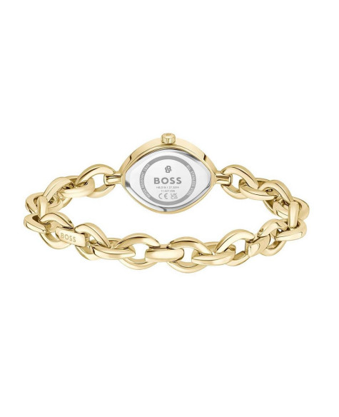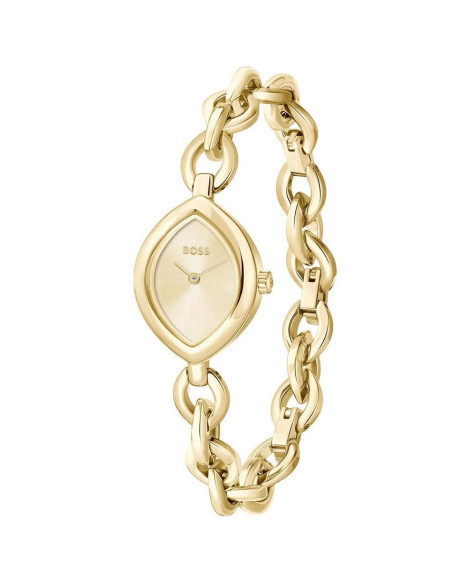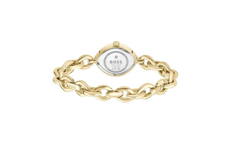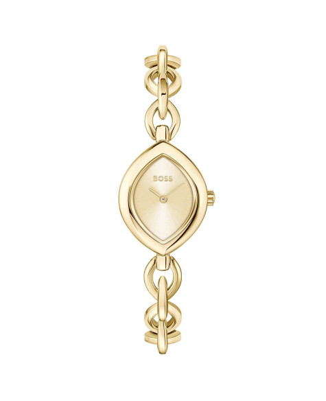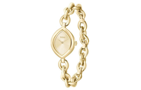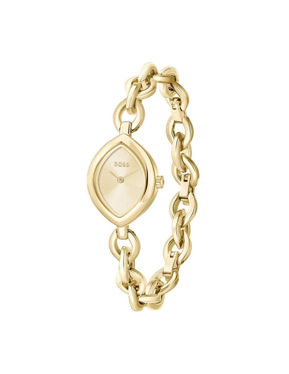 Le boîtier ovale de 22,4 mm en acier plaqué or ionique entoure un cadran champagne soleillé, paré d'aiguilles dorées pour une lisibilité élégante. Son bracelet chaîne à finition bijou lui confère une allure résolument joaillière, aussi belle portée seule qu'associée à d'autres pièces.