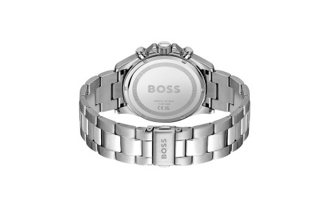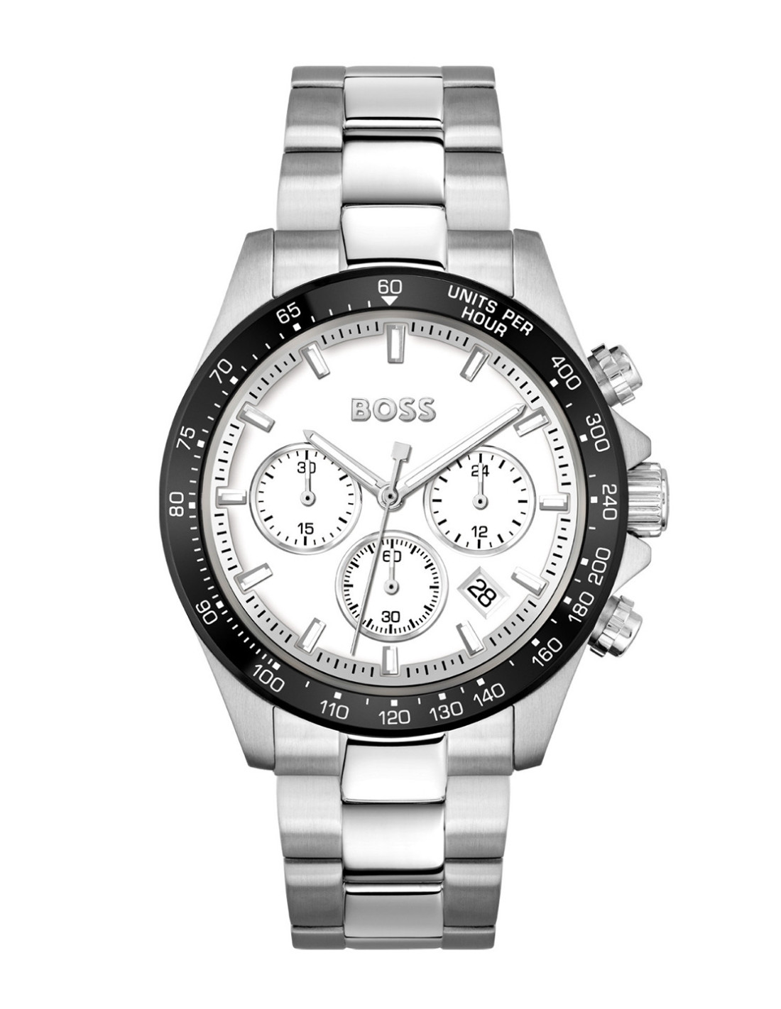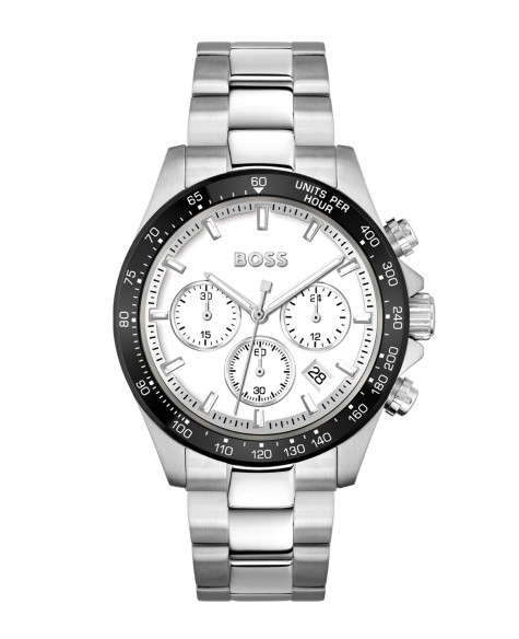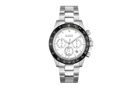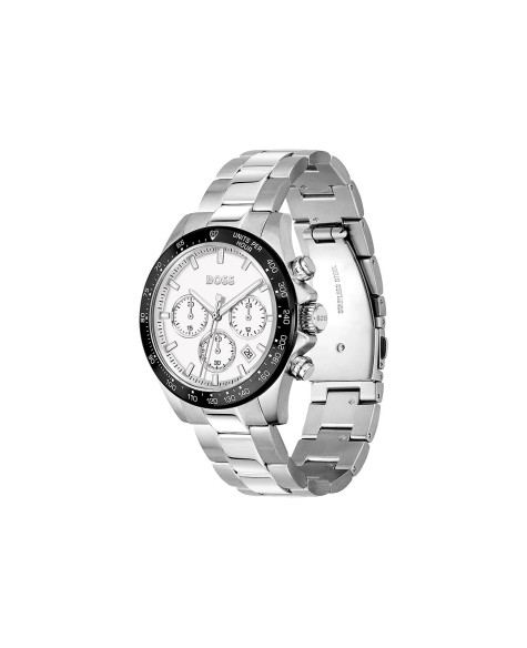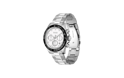 Son cadran blanc structuré, encadré par une lunette noire contrastée, offre une lisibilité immédiate et un style affirmé. Le chronographe intégré et le bracelet acier ajustable à boucle déployante en font une montre aussi pratique qu'élégante, adaptée à toutes les occasions.